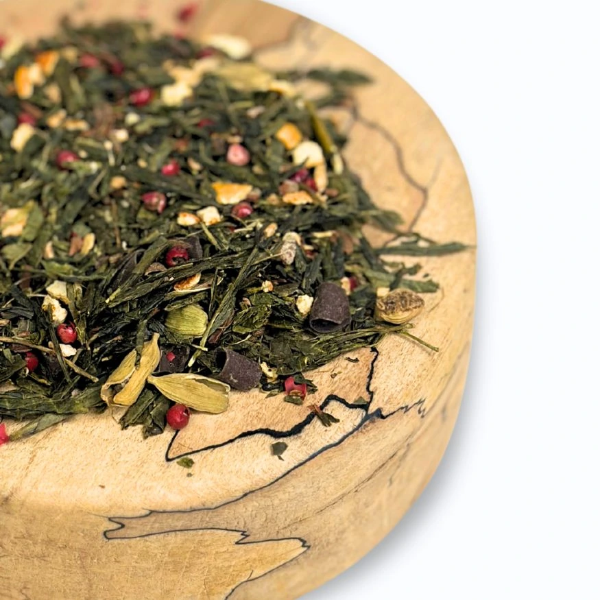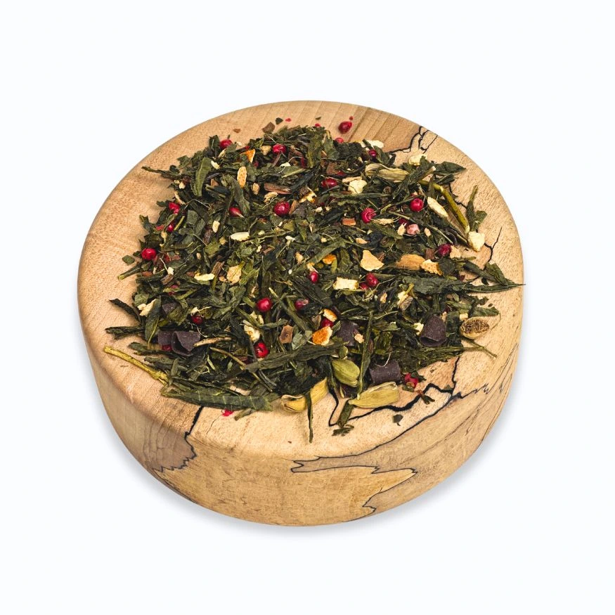 Herbata Arktyczny Ogień to niezwykła zielona herbata, która łączy orzeźwiającą senchę z pikantnymi przyprawami i słodkimi akcentami. Cynamon, czekolada, skórka pomarańczy, kardamon, imbir oraz czerwony pieprz tworzą wyjątkową mieszankę o intensywnym smaku i aromacie, który rozgrzewa i pobudza zmysły. To doskonały wybór dla osób, które szukają herbaty o pełnym, wyrazistym charakterze.