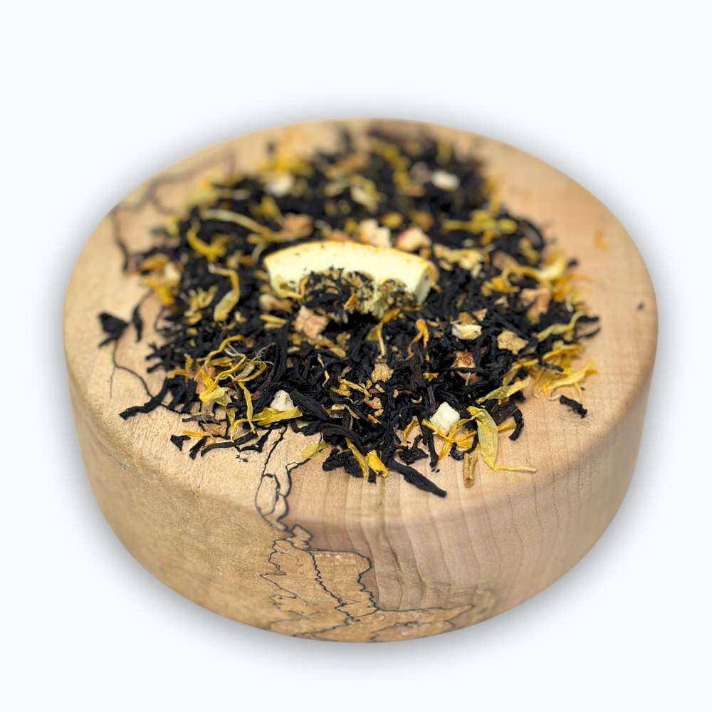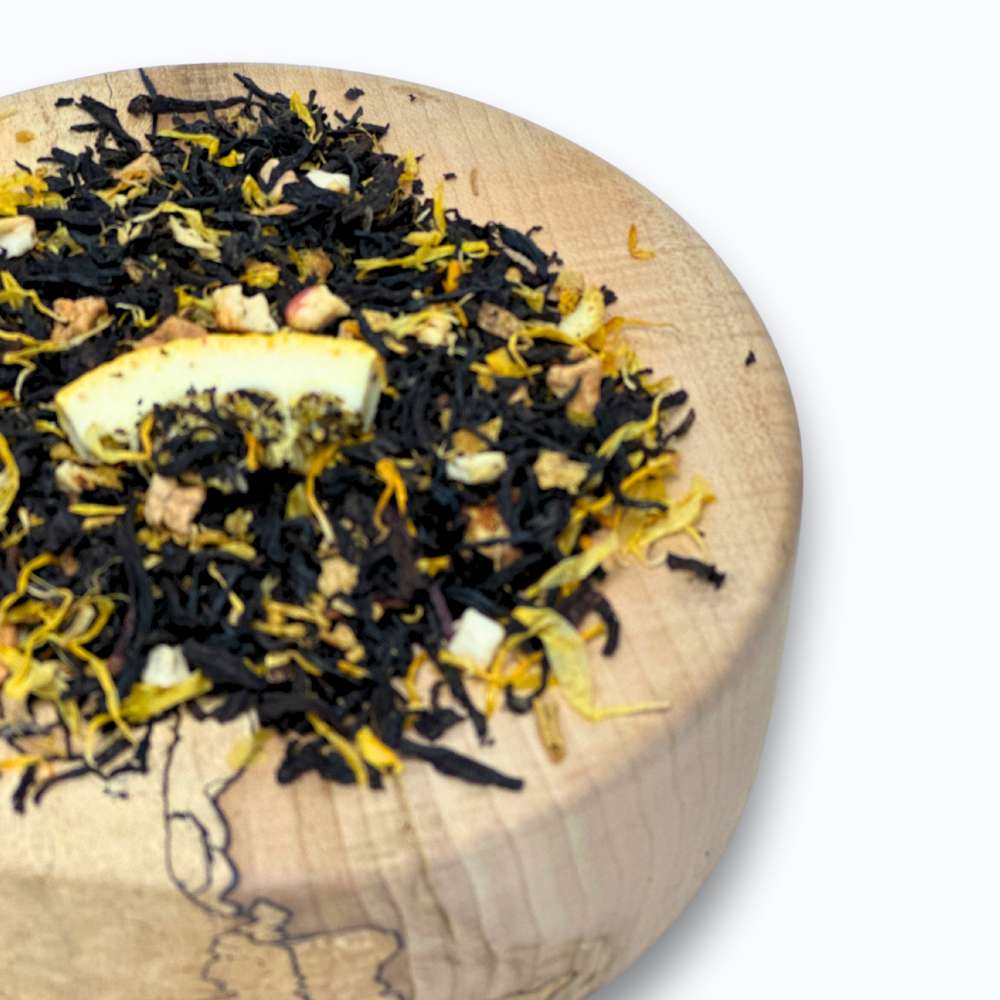Imbir Pomarańcza to zmysłowa czarna herbata, która łączy w sobie pikantność imbiru z orzeźwiającą świeżością pomarańczy. Imbir (8,5%) nadaje naparowi wyrazistego, korzennego charakteru, który doskonale komponuje się z naturalnymi nutami jabłka i skórki pomarańczy (4%). Całość dopełniają płatki nagietka, które wprowadzają subtelną kwiatową nutę, a kawałki pomarańczy (2%) i naturalne aromaty podkreślają cytrusowy smak.