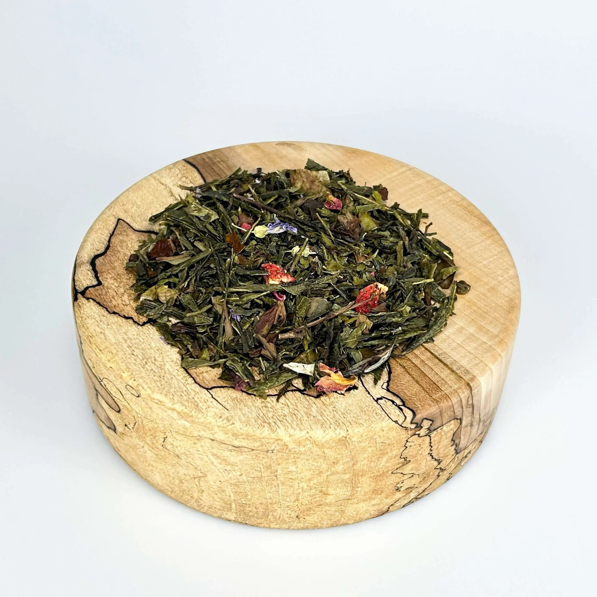 Skład “Egzotycznej Herbaty Zielonej” obejmuje zieloną herbatę Sencha, białą herbatę Pai Mu Tan, papaję, kandyzowany ananas, malinę, truskawkę, płatki róży, mango i płatki bławatka. To wyjątkowe połączenie tworzy napar o intensywnym, owocowym, lekko słodkim smaku i aromacie.