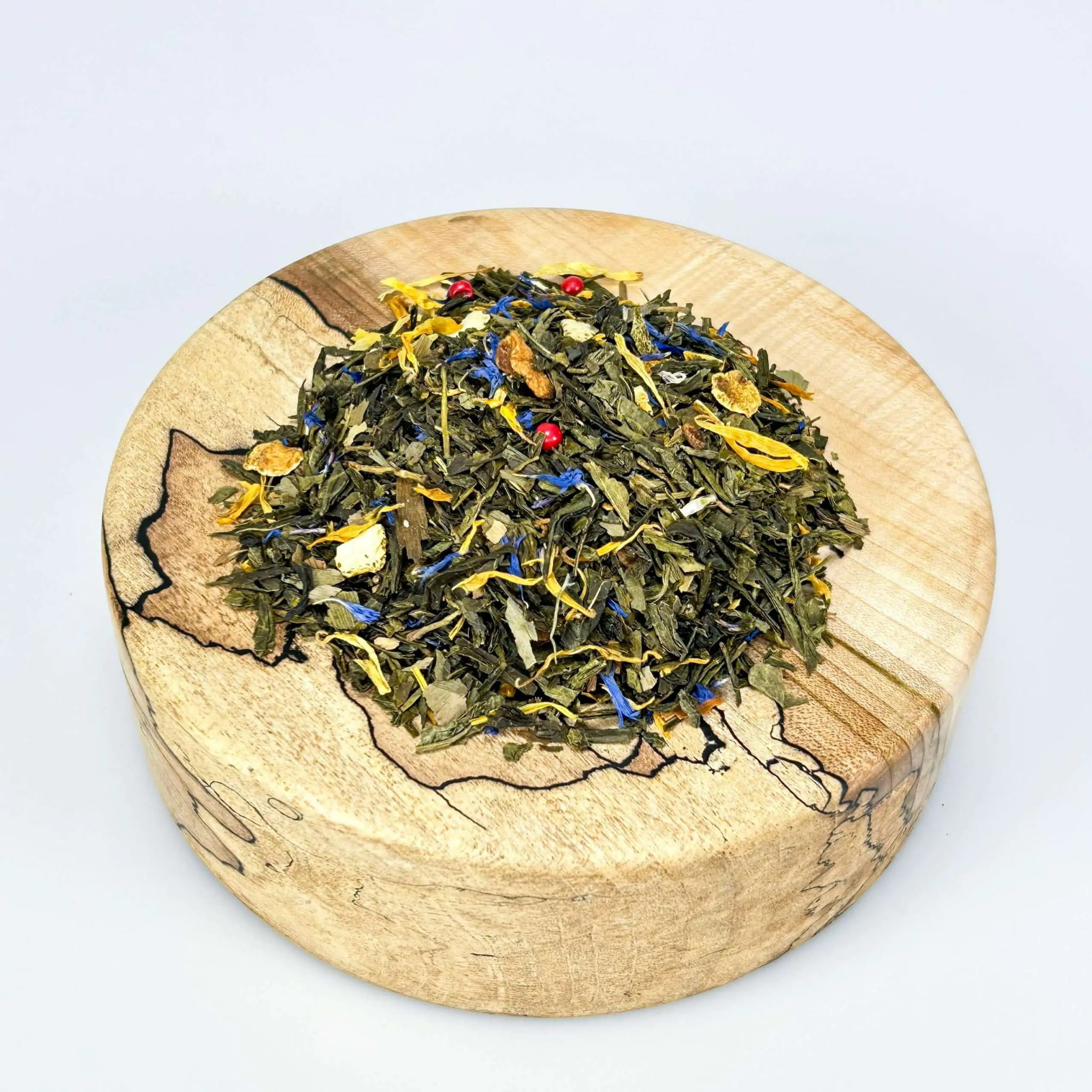 “Niebiańskie Życie” to herbata zielona aromatyzowana organiczna, która zachwyca nie tylko swoim wyglądem, ale również smakiem i aromatem. Składa się ona z najlepszej jakości zielonej herbaty, kawałków moreli, liści miłorzębu, skórki pomarańczy, aromatu naturalnego, różowego pieprzu, granulatu passiflory oraz płatków kwiatów nagietka i bławatka niebieskiego.