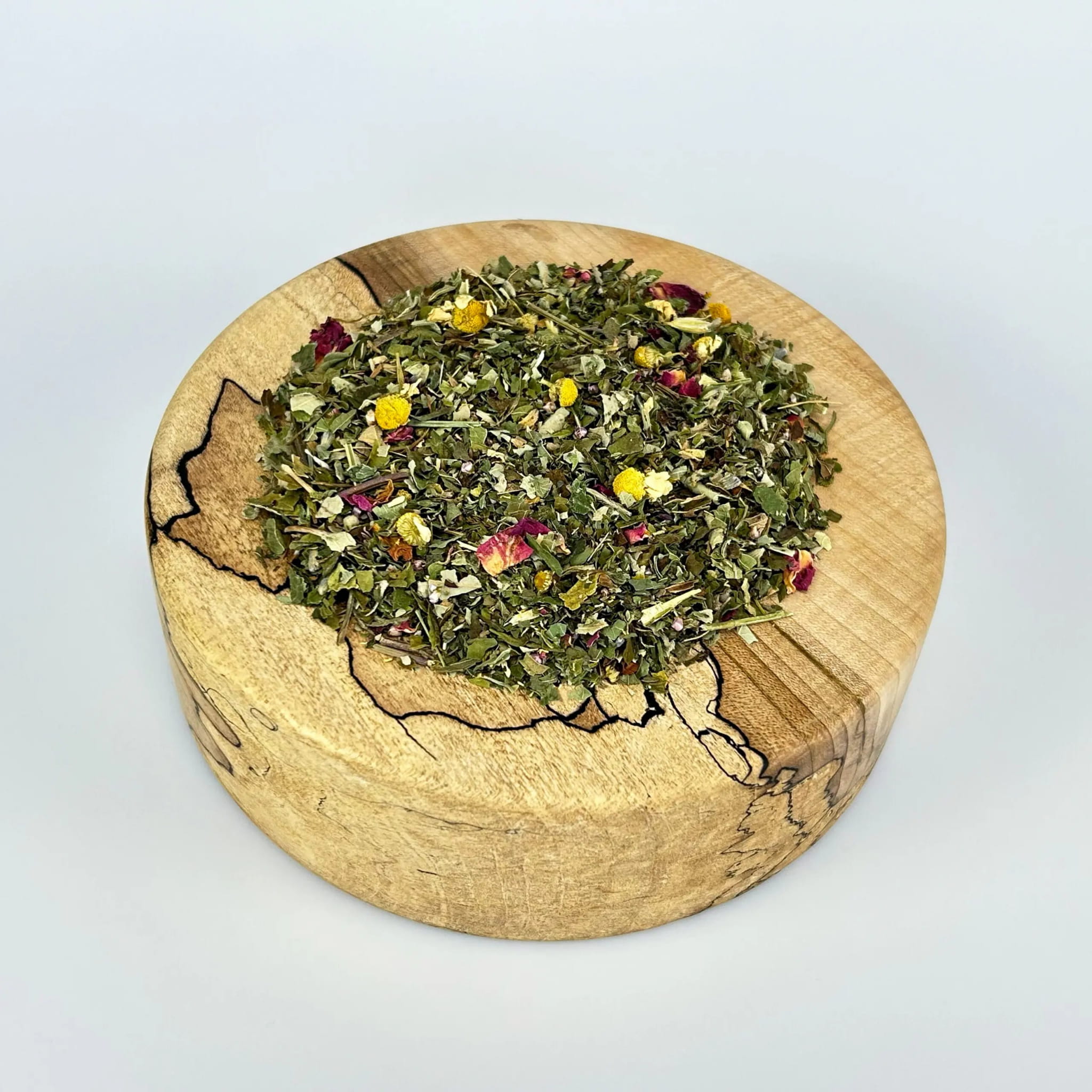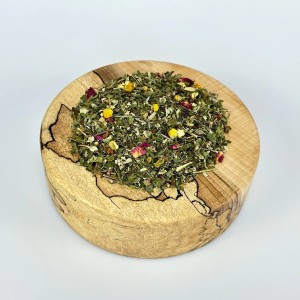 W jej kompozycji znajdziesz liście jeżyny, miętę pieprzową, melisę, płatki róży, rumianek, kwiaty wrzosu i lawendę. Czas parzenia tej herbaty to 10-15 minut.